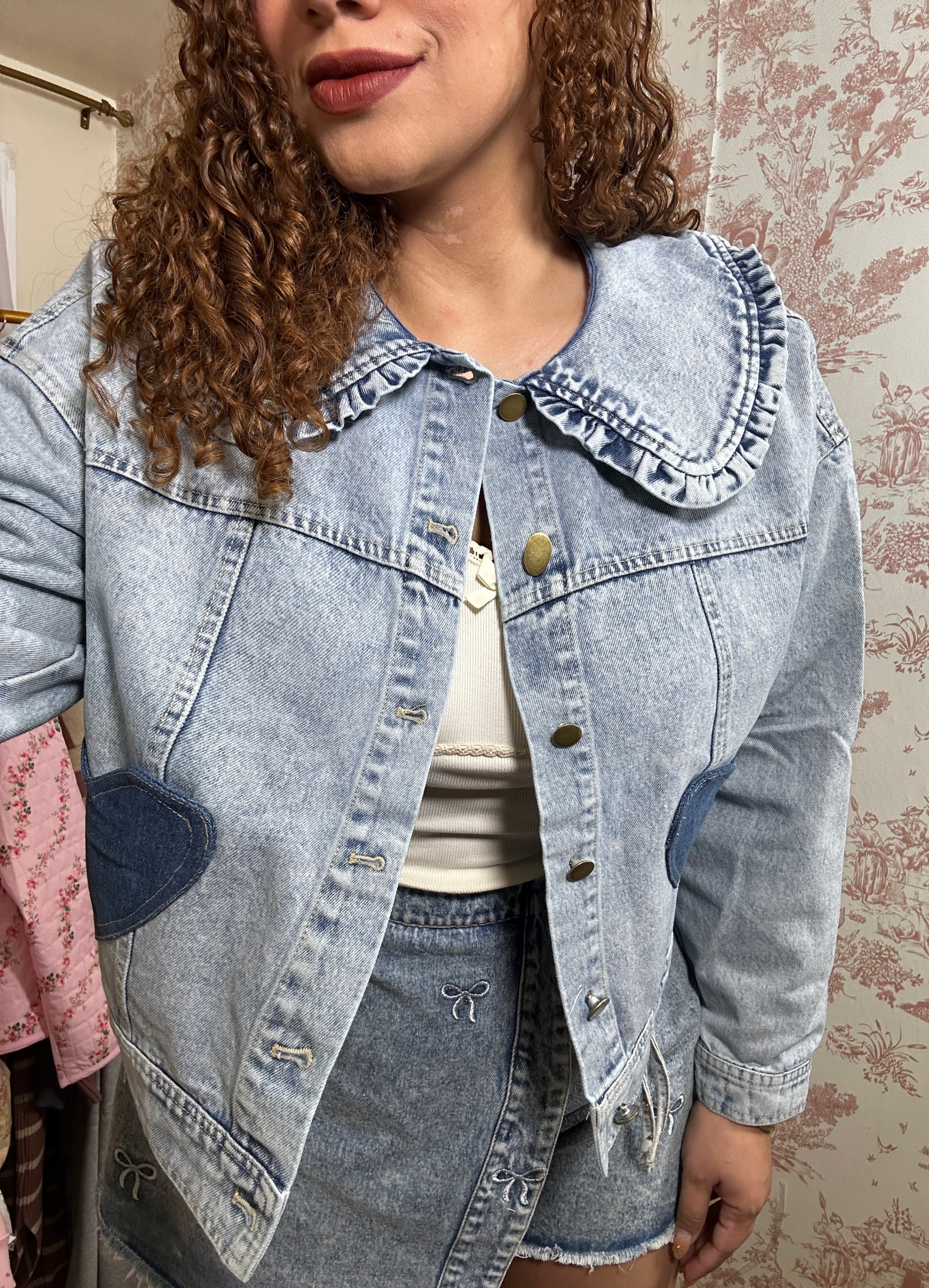 Amiel Hearts Castle Cotton Patch Denim Jacket With Ruffle Collar